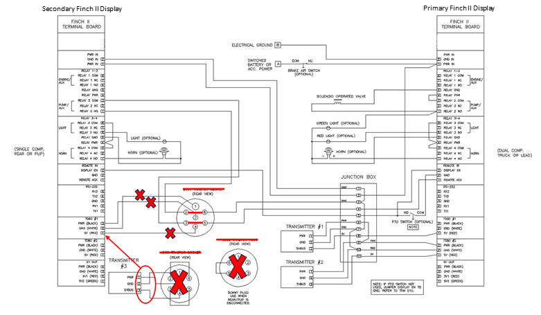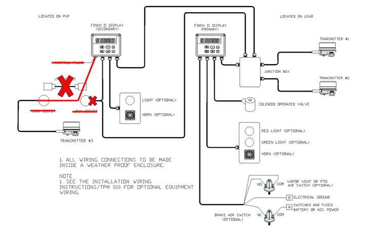 The two wiring diagrams below show the modifications required to go from a dual tank truck/trailer to a single unit. The red outlines on the right image show the modifications required for a single unit.