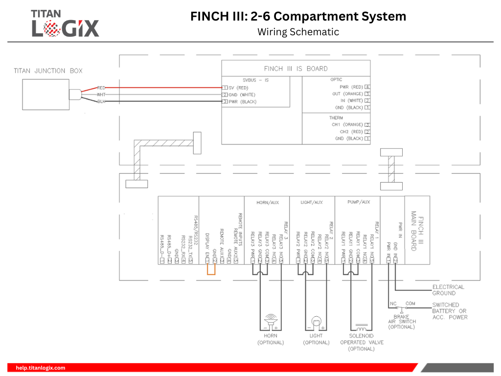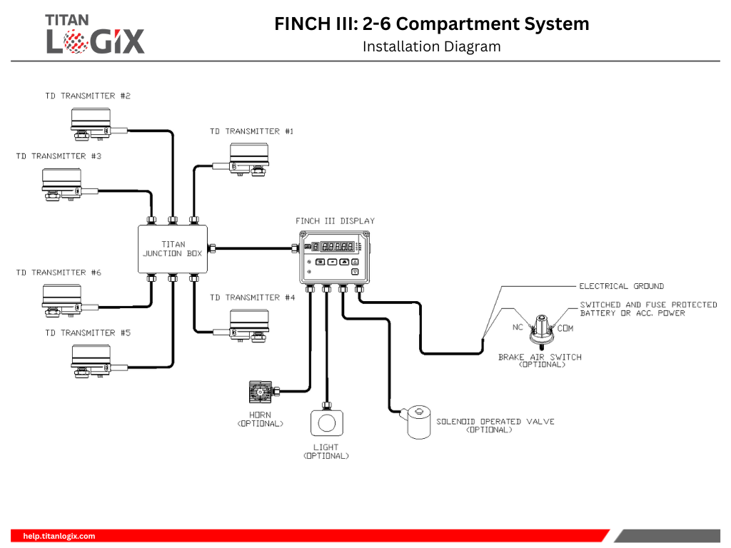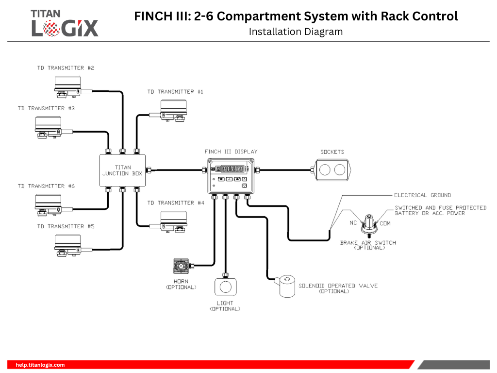The images below show a visual of a 2 - 6 compartment system, that includes an external horn and solenoid operated valve installed on the tank. Our Titan Smart Junction Box is required for 2 or more compartments, which assists in easier troubleshooting and wiring.
